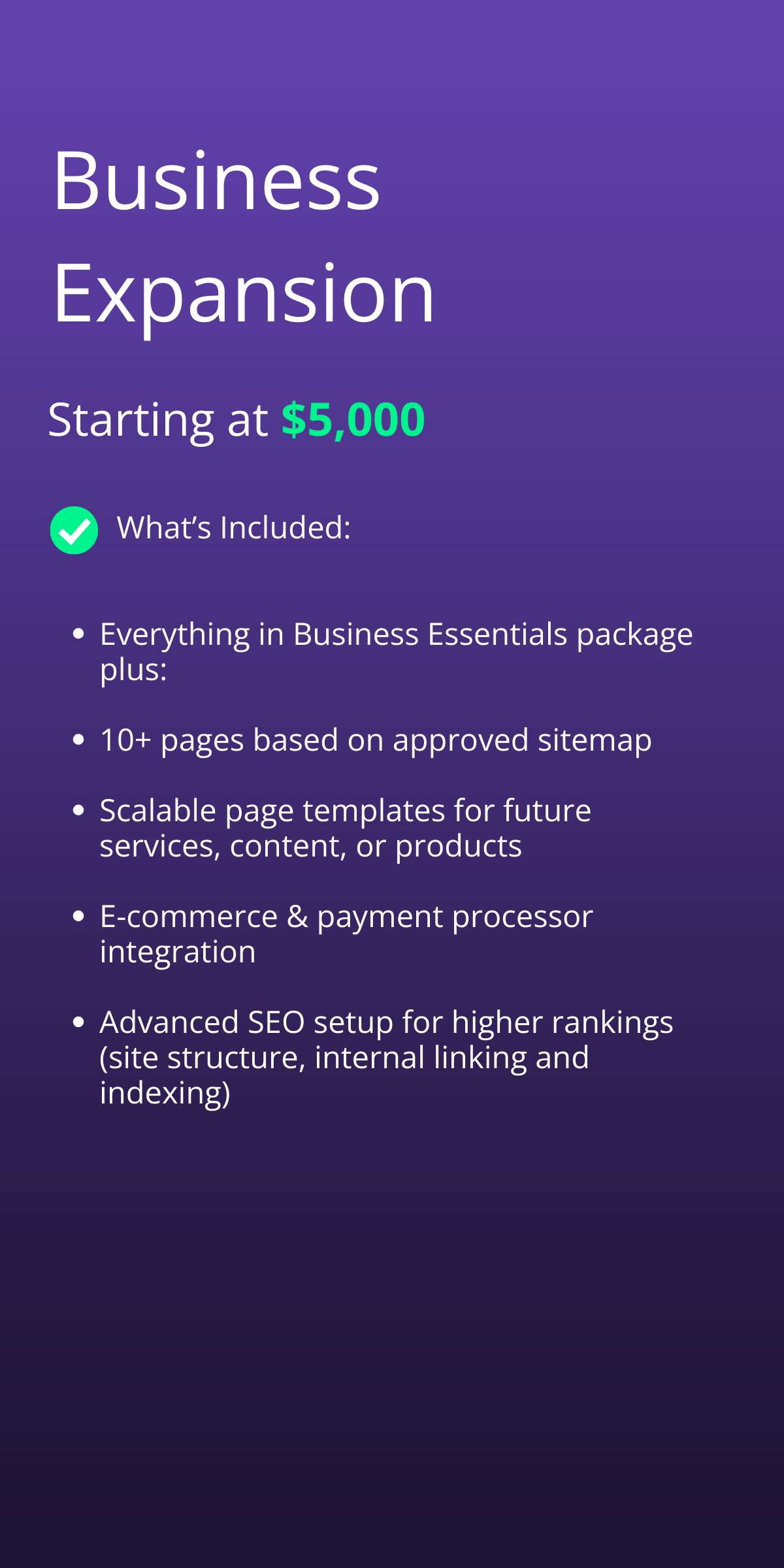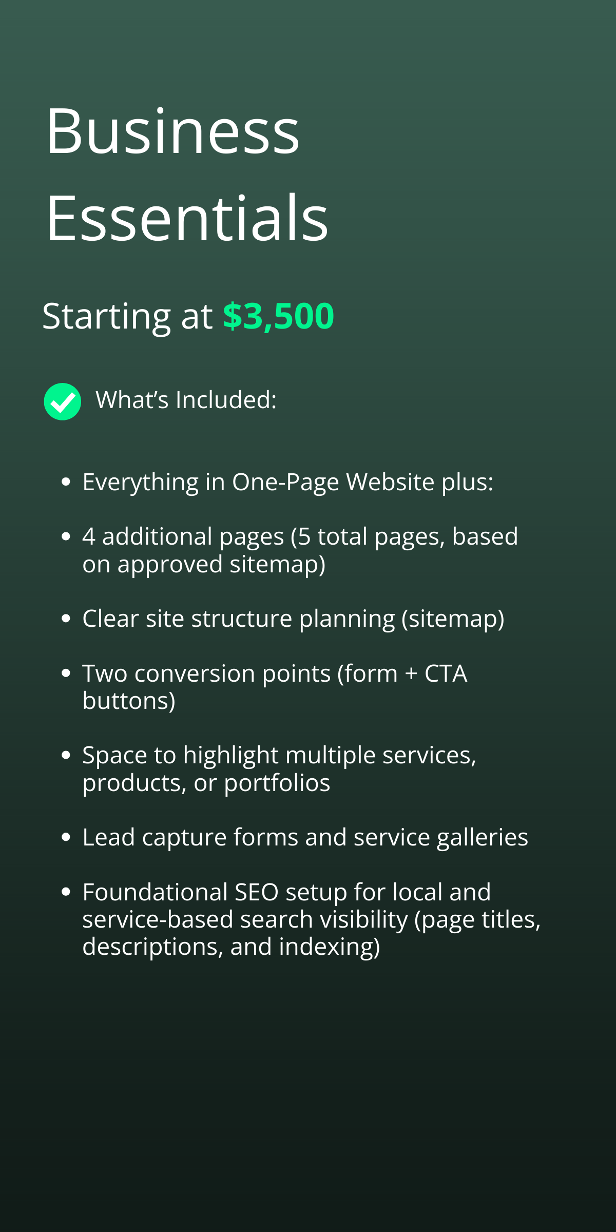 I build clean, modern, conversion-focused websites tailored to your brand. Sophisticated, custom-coded, timeless, and without the cost or complexity of a custom build.